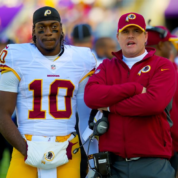 Anyone buying this? http://espn.go.com/nfl/story/_/id/1...redskins-starting-quarterback-says-jay-gruden Jay Gruden names RG III starting QB The quarterback competition that Washington Redskins coach Jay Gruden discussed after the season apparently has ended. Gruden told reporters at the NFL scouting combine Wednesday that Robert Griffin III will enter next season as the starter. Griffin, entering his fourth season, ended the season as the starter thanks to an injury toColt McCoy. [+] Enlarge John McDonnell/The Washington Post/Getty ImagesRobert Griffin III will enter next season as the Redskins' starting quarterback, coach Jay Gruden said Wednesday. "We'll go into the season with Robert as our No. 1 guy," Gruden said. "It's up to Robert to continue to grow and mature as a quarterback and as a person. Moving forward we want to see improvement. It's up to us as a staff to get more out of him." It's not a surprise, given the investment made in Griffin three years ago. But it was surprising after what Gruden had said after last season ended. After the Redskins finished a 4-12 season, one that saw Griffin benched for his performance, Gruden said of his quarterbacks, "I'd like to pick one as soon as I could so we could try to work and grind on him and develop him. But until that position is earned, you have to have a competition. I anticipate us having a competition at a lot of spots, and quarterback is no different next year." The only other quarterback on the roster under contract for 2015 is Kirk Cousins. He took over last year when Griffin injured his ankle in Week 2. Cousins threw 10 touchdowns and nine interceptions, but five of those picks occurred in the fourth quarter, and all but one came in the second half. That led to his being benched for McCoy; Cousins never played again. McCoy is a free agent who might return. In nine games, Griffin completed 68.7 percent of his passes for 1,694 yards, four touchdowns and six interceptions for a passer rating of 86.9. In his last two starts, Griffin was a combined 43-of-64 passing for 556 yards but only one touchdown and three interceptions. He was sacked 29 times in his last seven games thanks in part to an offensive line that needs improving but also owing to a tendency to hold the ball too long. Griffin's first season with Gruden was greeted with more rumors and negative stories, including one that started with a harsh assessment of his performance by the head coach. To help Griffin and the quarterbacks in general, the Redskins hired longtime quarterbacks coach Matt Cavanaugh. Last year, Gruden and offensive coordinator Sean McVay handled the quarterbacks. But Gruden, a former college quarterback, said other demands prevented him from spending enough time with the position. "To have another element working with Robert is a good thing," Gruden said. Griffin also will spend time in the offseason with quarterbacks guru Terry Shea, as he did before the 2012 draft and again last offseason. The coaches can't work with Griffin until workouts begin in late April. "Robert is a hard worker," Gruden said. "He works hard on his body and his strength, but we will have things drawn up for him, specific things that he can do to get better from the quarterback position mechanics-wise, throwing-wise, drop-wise. He has a good idea of what we did in OTAs and during the season with footwork and fundamentals that he'll continue to build on. Hiring Cavanaugh will only help in that process." _